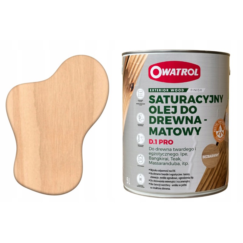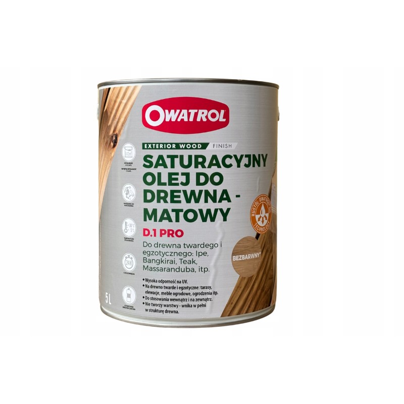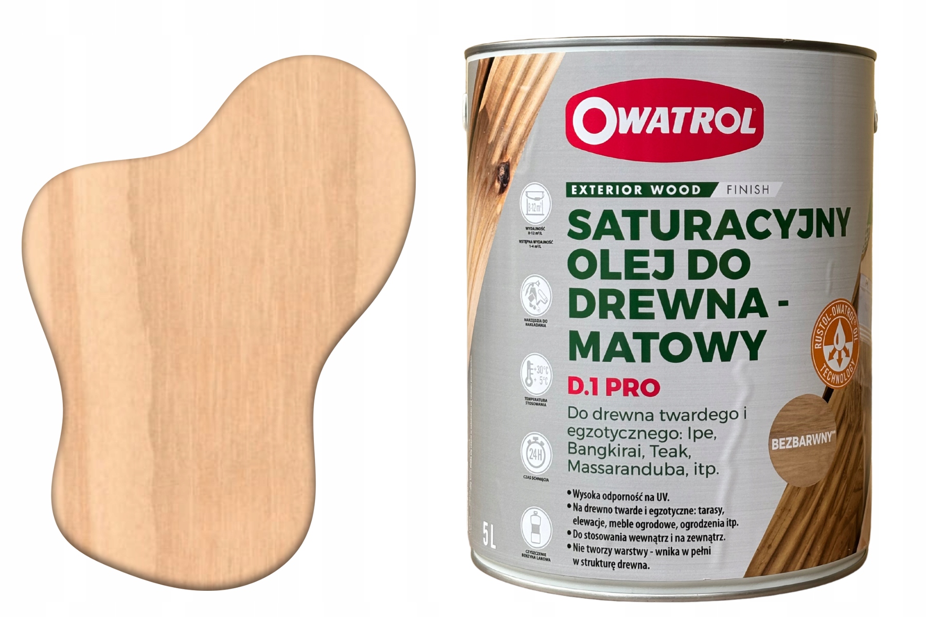 Owatrol D1 PRO to profesjonalny olej do nasycające drewna z dodatkową ochroną UV. Produkt jest nowy i zapakowany w oryginalne opakowanie marki Owatrol. Stan opakowania: oryginalne. Kod producenta: 3297971109758. Posiada pojemność 5 litrów, idealny do zastosowania na tarasach drewnianych. Olej ten będzie doskonałym wyborem dla tych, którzy chcą zabezpieczyć drewno przed szkodliwymi warunkami atmosferycznymi, zapewniając mu długotrwałą ochronę. Dzięki formule bezbarwnej nie zmienia naturalnego wyglądu drewna.