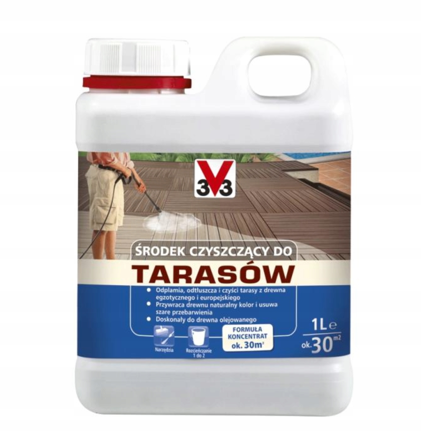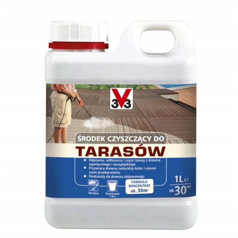 Drewno surowe lub olejowane: powierzchnię oczyścić usuwając kurz, a następnie rozcieńczyć Środek do czyszczenia tarasów V33 z wodą w proporcji 1L produktu 2L letniej wody