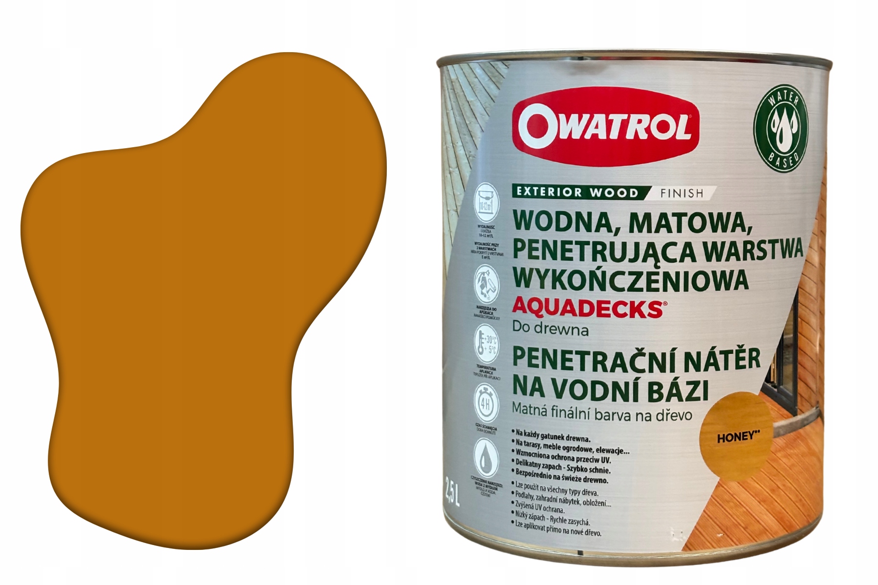 AQUADECKS saturator do wszystkich gatunków drewna 2,5L HONEY to doskonały wybór dla Twoich podłóg z drewna. Ten nowy produkt marki Owatrol, jest wykonany z żywicy o pojemności 2,5 litra. Dzięki kolorowi honey, nada Twoim podłogom ciepły i naturalny wygląd. Saturator ten idealnie zabezpiecza drewno, zapewniając mu trwałą ochronę. Odpowiedni do wszystkich rodzajów drewna. Niezawodny sposób na zachowanie piękna i jakości Twoich podłóg!