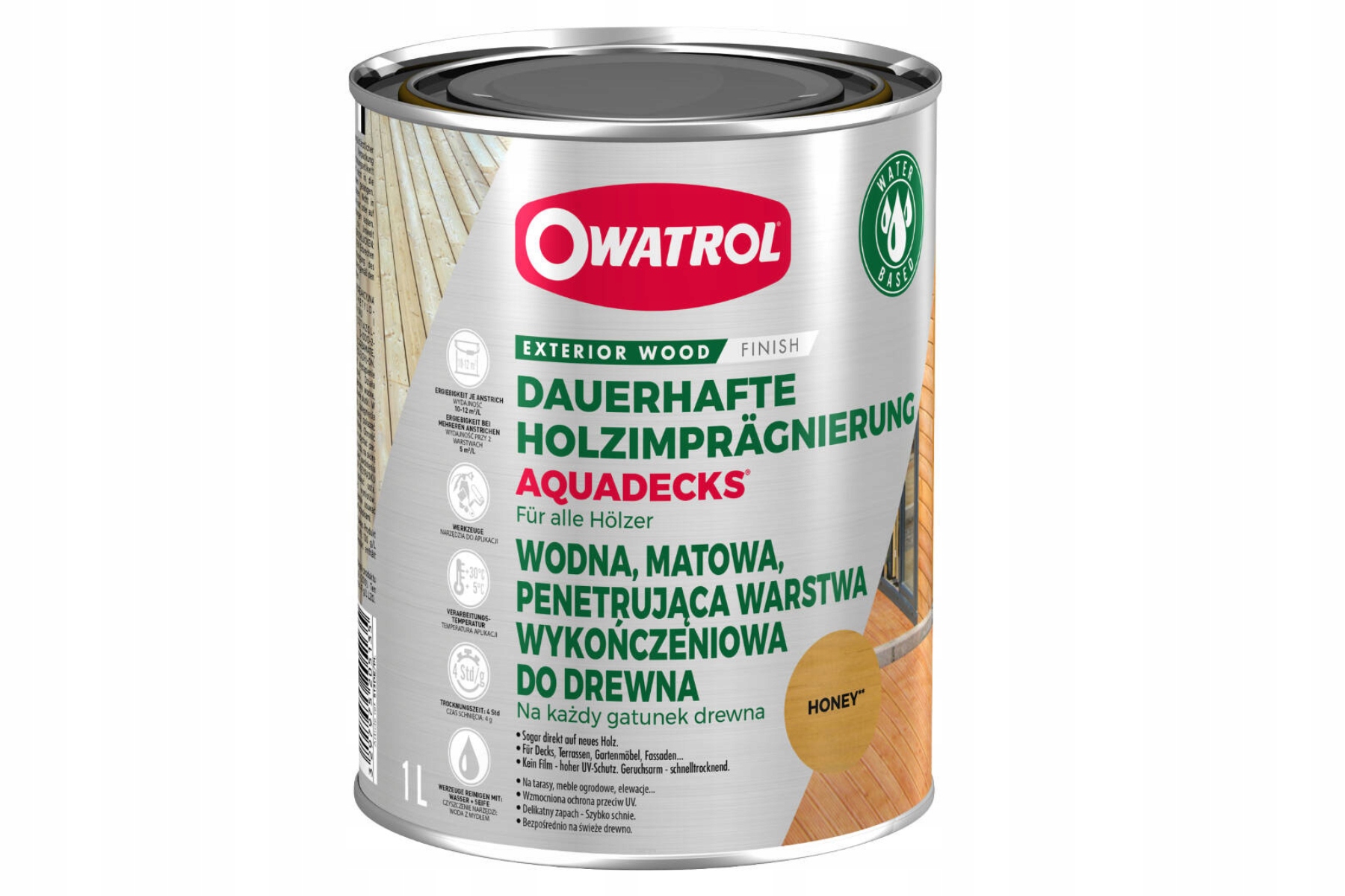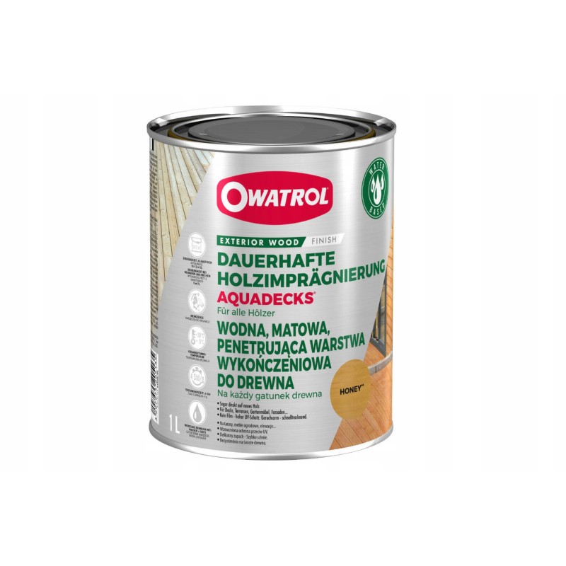 AQUADECKS to doskonały saturator do wszystkich gatunków drewna o pojemności 1 litra w kolorze Miodowym. Produkt marki Owatrol cechuje się wysoką jakością i wydajnością. Saturator ten zapewnia ochronę drewna, nadając mu piękny wygląd. Dzięki zastosowanej żywicy, drewno staje się bardziej wytrzymałe i odporne na działanie warunków atmosferycznych. Idealny do użytku wewnętrznego i zewnętrznego. Produkt nowy, zapakowany fabrycznie. Odnajdziesz go w kategorii Chemia do podłóg.