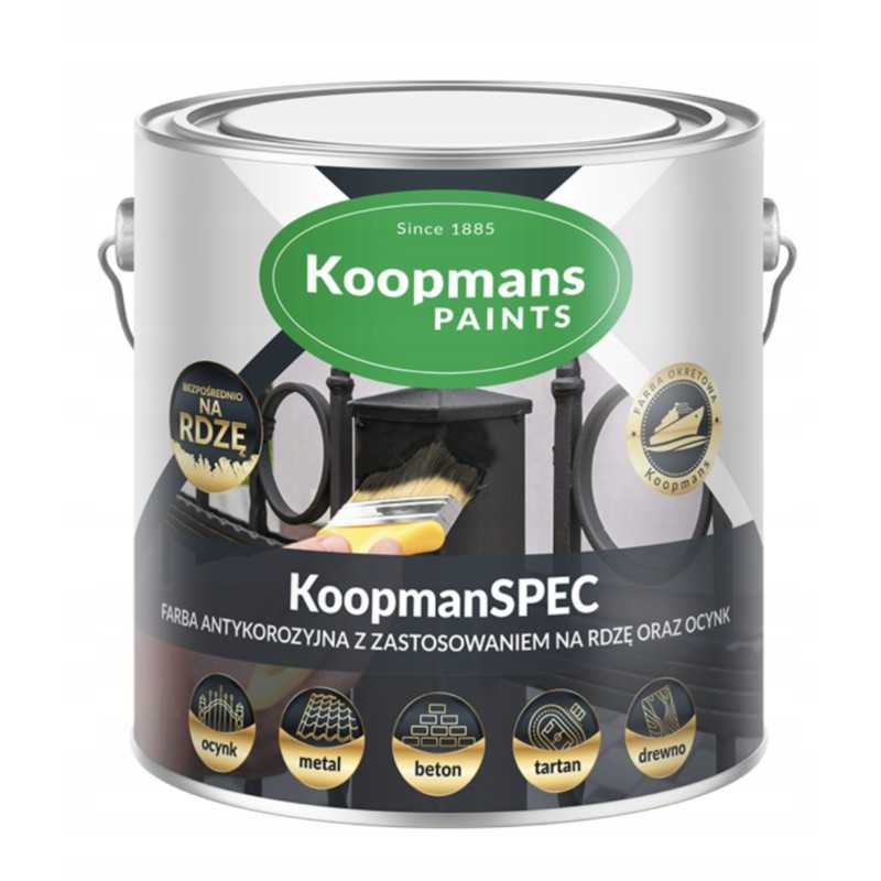 KoopmanSpec to wielozadaniowy produkt przeznaczony do ochronno-dekoracyjnego i antykorozyjnego zabezpieczania wielu rodzajów powierzchni. Dzięki unikalnej formule można go stosować bezpośrednio na podłoże, bez konieczności użycia farb podkładowych.