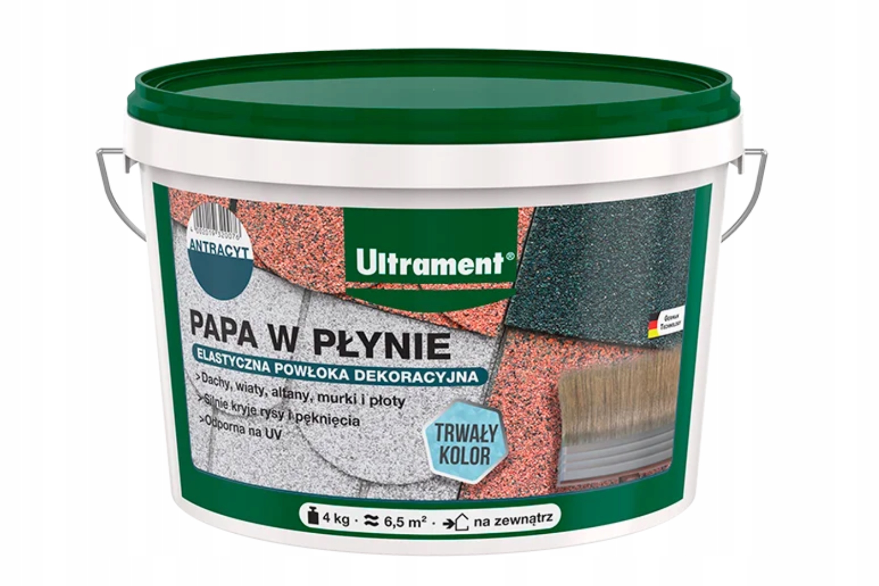 Ultrament Papa W Płynie 4KG Antracyt to rewolucyjny produkt marki Ultrament, który zapewnia doskonałą ochronę dachu. Ta elastyczna powłoka uszczelniająca ma pojemność 4 litrów i jest w kolorze szarym, idealnie pasującym do wielu rodzajów dachów. Stanowi idealne rozwiązanie do renowacji dachu, zapewniając nie tylko ochronę przed warunkami atmosferycznymi, ale także nadając estetyczny wygląd. Dzięki oryginalnemu opakowaniu i wysokiej jakości materiałom, produkt ten gwarantuje trwałość i skuteczność.