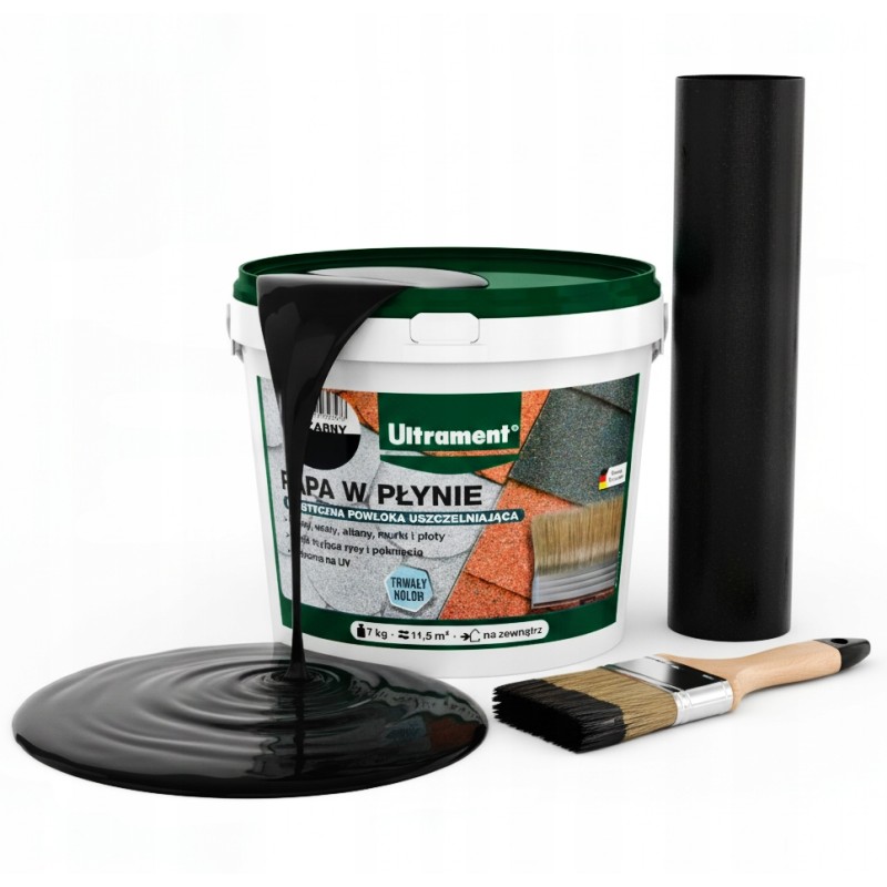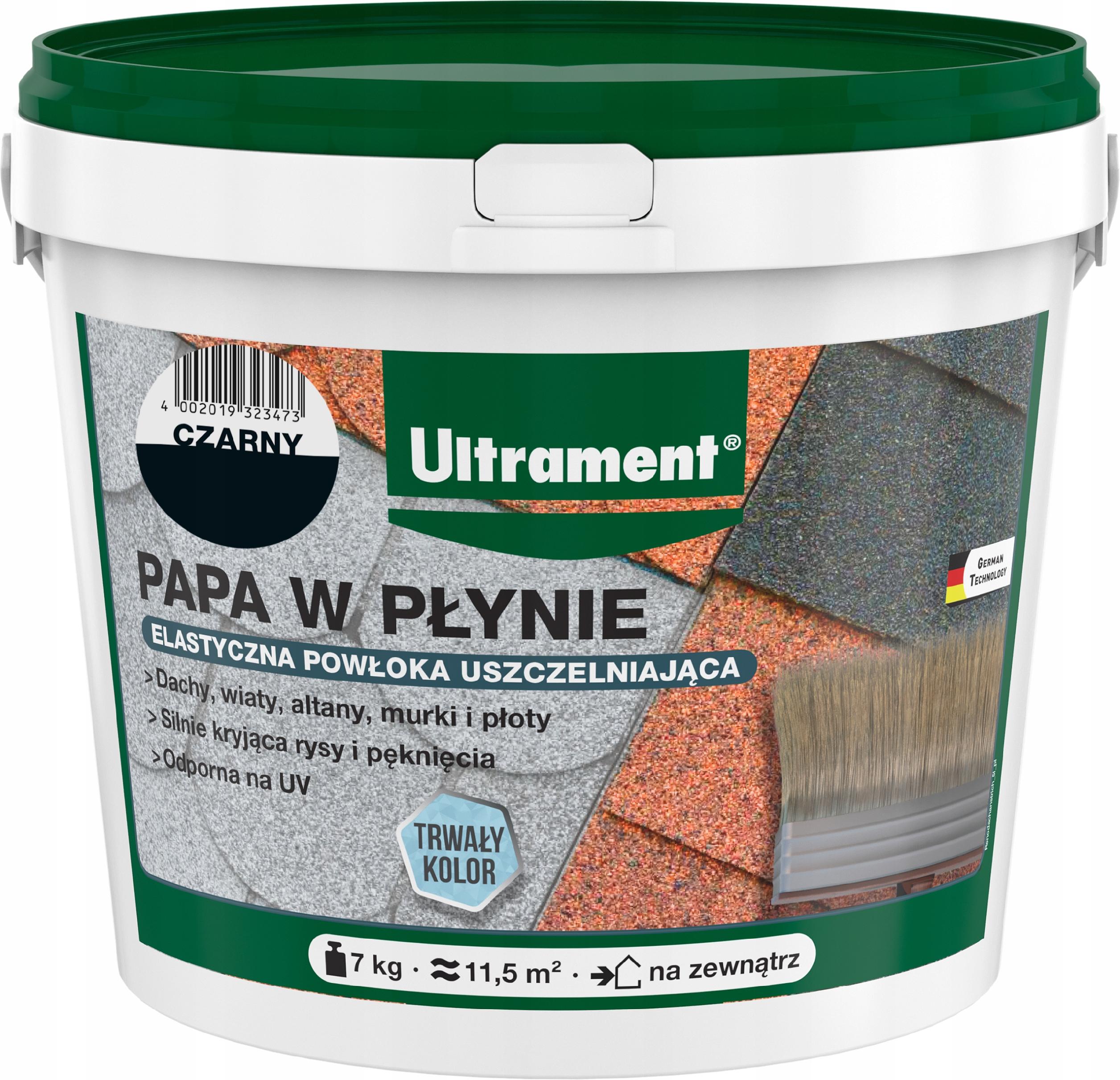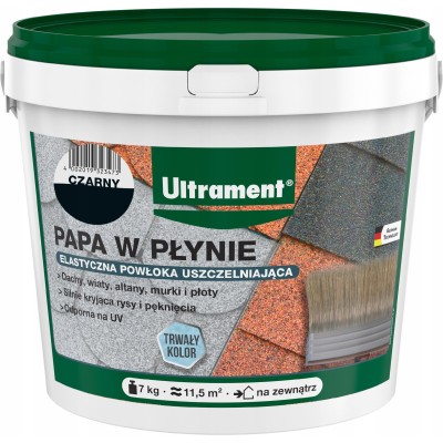 Ultrament Papa W Płynie 7KG to doskonały produkt do uszczelniania dachów. Dzięki swojej elastycznej i trwałej czarnej powłoce zapewnia skuteczną ochronę przed wodą i warunkami atmosferycznymi. Produkt jest nowy, zapakowany w oryginalne opakowanie od marki Ultrament. Jego waga wynosi 7 kg, a łącznie z opakowaniem jednostkowym – 7,2 kg. Pojemność to 7 litrów. Ten renowator doskonale sprawdzi się jako farba i uszczelniacz do dachów, gwarantując trwałą ochronę i doskonałe rezultaty.