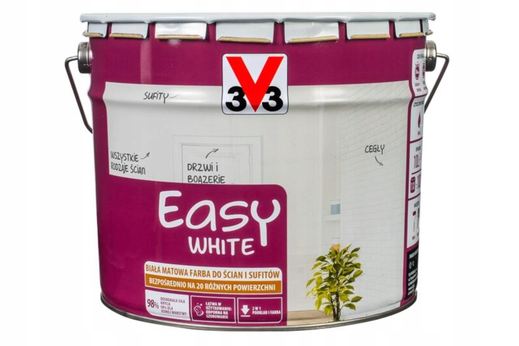 Nasza biała farba do ścian i mebli drewnianych to doskonałe rozwiązanie dla tych, którzy szukają trwałego i plamoodpornego wykończenia. Produkt marki V33 cechuje się wysoką jakością oraz ekologicznym składem. Farba akrylowa w kolorze białym ma matowy połysk i szybki czas schnięcia. Dzięki temu produktowi łatwo nadać pomieszczeniom świeży i nowoczesny wygląd. Wielkość opakowania wynosi 10 litrów, a deklarowana wydajność to aż 15 kg. Z naszą farbą odświeżysz swoje wnętrza szybko i efektywnie!