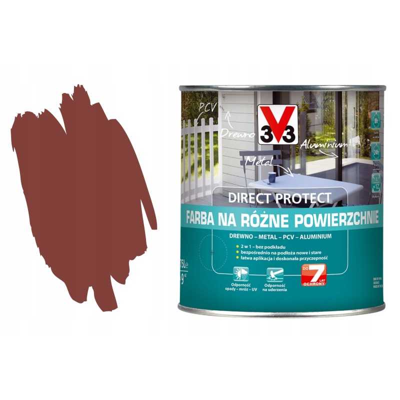 Farby Direct Protect V33 nie stosować na podłogi, podłoża murowane, drewno olejowane lub woskowane oraz na elementy z giętkiego plastiku (np. plastikowe meble ogrodowe, doniczki itp.).