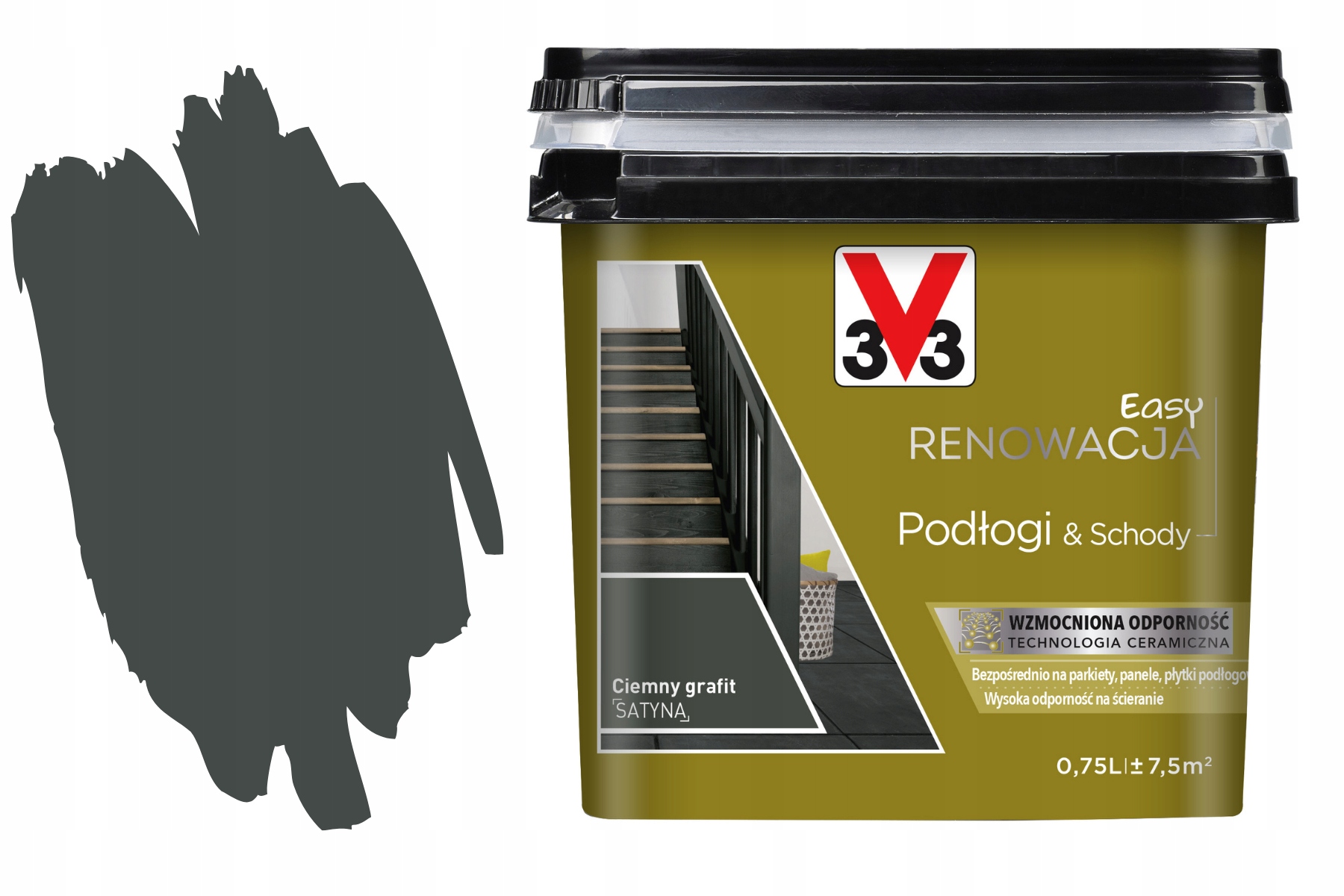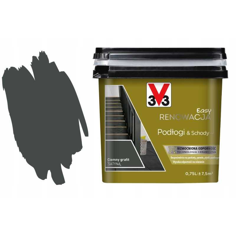 3V3 Easy Renowacja PCV Kafli Płytki Schody Garaż Boazeria Grafitowy 750ML to doskonała farba akrylowa do drewna i płytek. W kolorze Ciemnego Grafitu, zapewnia elegancki wygląd i trwałą ochronę. Dzięki satynowemu połyskowi nadaje się idealnie do odnawiania powierzchni takich jak schody, garaże, czy boazeria. Szybkie schnięcie w czasie 3 godzin oraz deklarowana wydajność na poziomie 9 m2 sprawiają, że praca jest szybka i skuteczna. Produkt marki V33 gwarantuje wysoką jakość i trwałość.