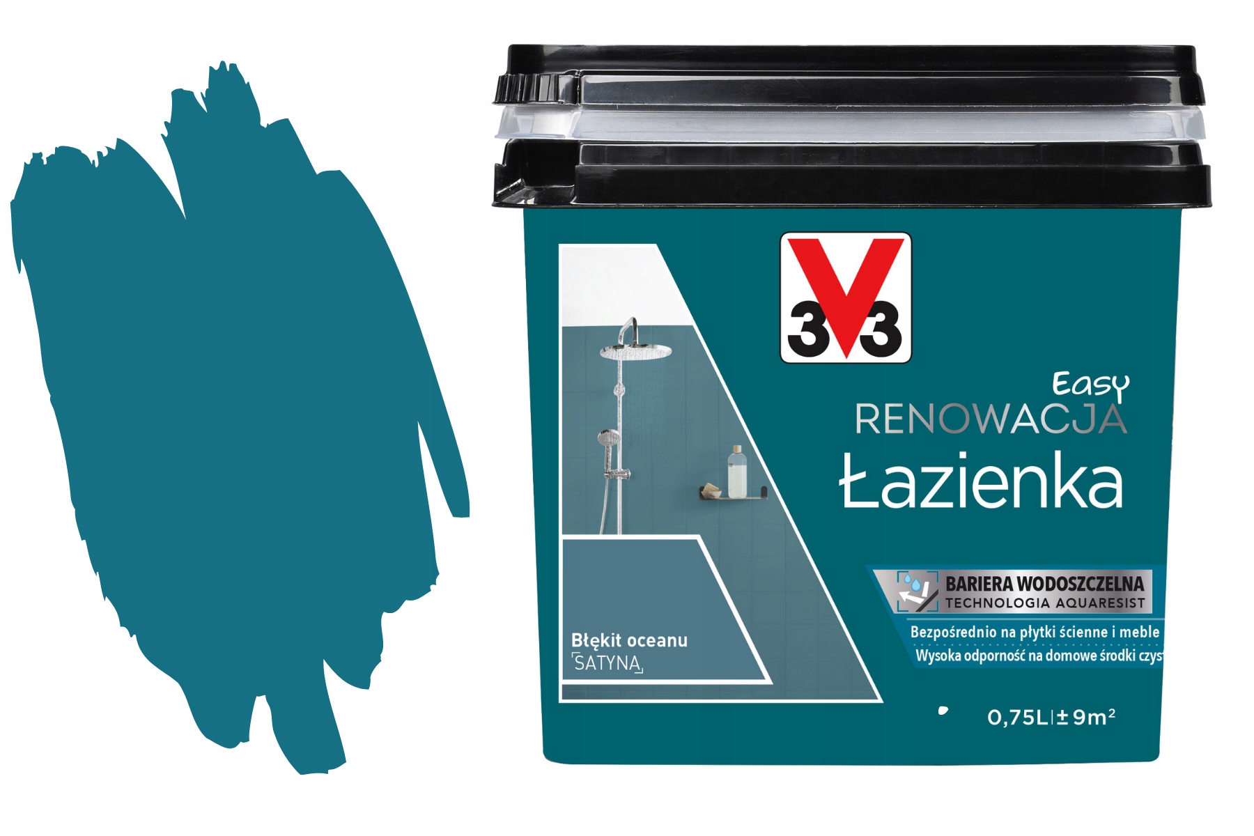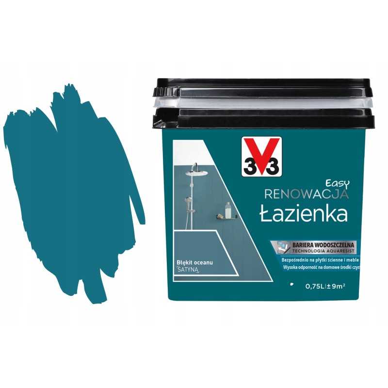3V3 Farba Akryl Eko Wodna Kafli PCV Szybka Odnowa Boazerie Ceramic 0.75L to innowacyjna farba akrylowa, idealna do odświeżania kafli i boazerii. W kolorze Błękit oceanu, ta farba zapewnia satynowe wykończenie, które odświeża dowolne wnętrze. Dzięki szybkiemu czasowi schnięcia w dotyku (8 godzin) oraz pełnego wyschnięcia (48 godzin), możemy cieszyć się nowym wyglądem pomieszczenia w krótkim czasie. Farba jest łatwa w użyciu, można ją rozcieńczać wodą, co sprawia, że malowanie staje się przyjemne i efektywne.