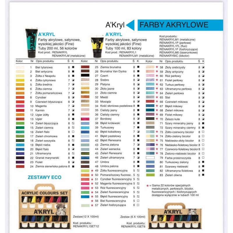 Farby akrylowe z serii A’KRYL RENESANS to idealny wybór dla osób poszukujących niezawodnej jakości w atrakcyjnej cenie. Doceniane przez początkujących i doświadczonych twórców, zapewniają intensywne kolory, łatwą aplikację i trwałe rezultaty.