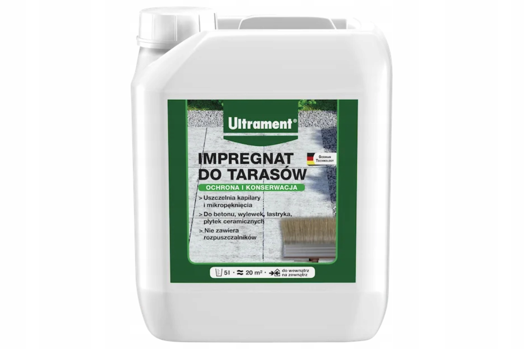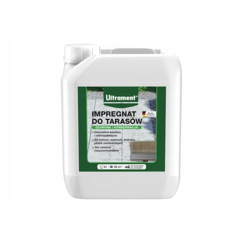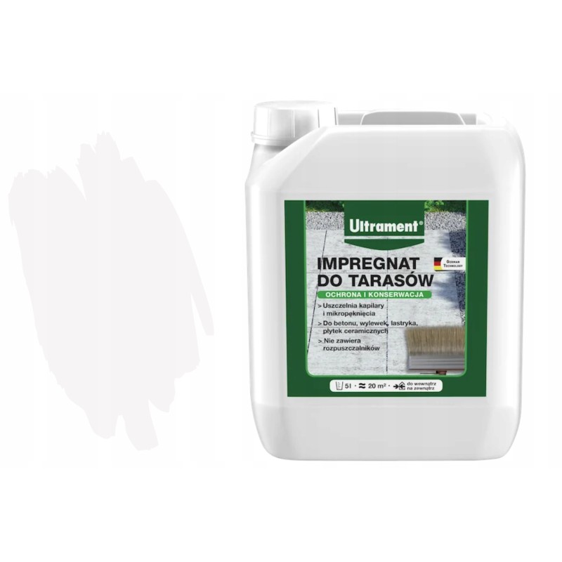 Ultrament Impregnat do tarasów 5l to doskonałe rozwiązanie dla ochrony tarasów. Produkt jest nowy i zapakowany w oryginalne opakowanie, które zapewnia ochronę przed szkodliwymi warunkami atmosferycznymi. Dzięki kodowi producenta ULTRAMENT Impregnat do tarasów 5L oraz marce Ultrament, możesz mieć pewność, że otrzymujesz produkt najwyższej jakości. Impregnat ma pojemność 5 litrów i przeznaczony jest do betonu oraz kamienia, zapewniając im wodoszczelność. Teraz Twój taras będzie chroniony i piękny przez wiele lat!