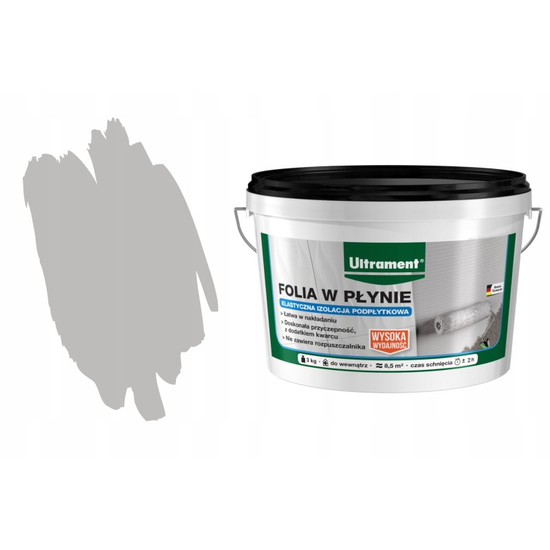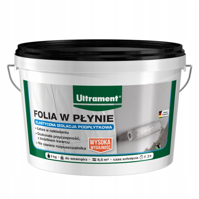 Prezentujemy nową folię w płynie pod płytki do łazienki marki Ultrament o pojemności 3 kg. Produkt ten jest idealny do zastosowania na betonie, zapewniając trwałą ochronę. Folia posiada szary kolor, a jej deklarowana wydajność wynosi 2,83 metra kwadratowego. Opakowanie jest oryginalne, a kod producenta to "folia w płynie". Wzbogać swoją łazienkę o ten produkt, który zagwarantuje nie tylko estetyczny wygląd, ale także długotrwałą ochronę przed wilgocią i uszkodzeniami.