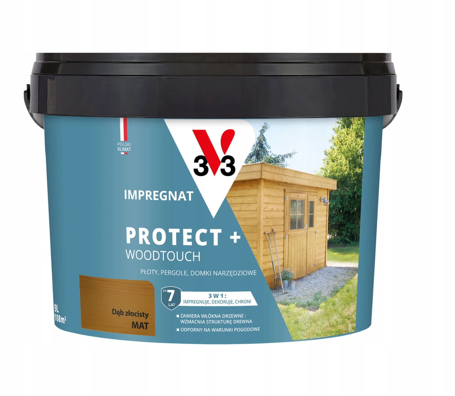 V33 Impregnat Protect+ dąb złocisty 9l to innowacyjny impregnat do drewna, który zapewnia maksymalną ochronę na zewnątrz. Odporny na owady, produkt ten posiada deklarowaną wydajność 1, co sprawia, że jest niezastąpiony w pielęgnacji drewnianych elementów na tarasie czy ogrodzie. Dzięki swojemu bezbarwnemu kolorowi, impregnat zachowuje naturalny wygląd drewna, chroniąc je jednocześnie przed działaniem warunków atmosferycznych. Sposób rozcieńczania wodą oraz krótki czas schnięcia (12 godzin) sprawiają, że aplikacja impregnatu jest łatwa i skuteczna.