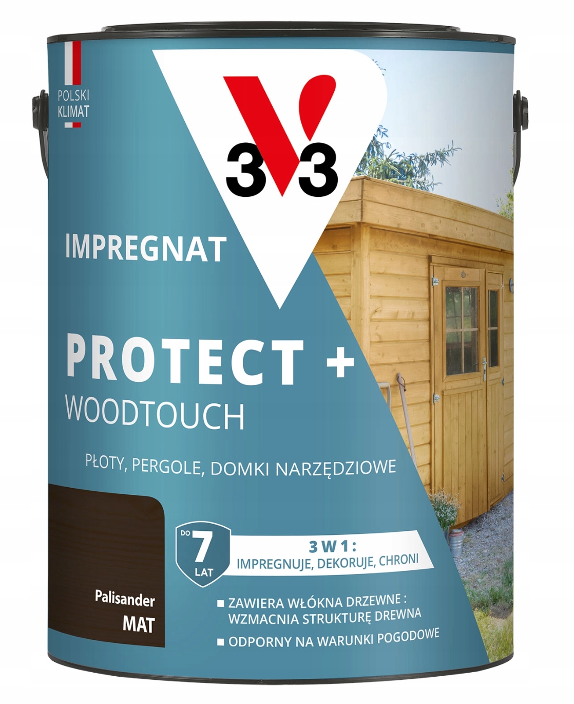 V33 Impregnat Protect+ w kolorze palisander o pojemności 4,5 litra to doskonałe rozwiązanie do zabezpieczania drewnianych elementów na zewnątrz. Dzięki funkcji owadobójczej chroni nie tylko przed wilgocią, ale także szkodnikami. Produkt cechuje się szybkim czasem schnięcia - już po 12 godzinach drewno będzie gotowe do użycia. Impregnat jest łatwy w rozcieńczaniu wodą i ma deklarowaną wydajność 1 litra na metr kwadratowy. Oryginalne opakowanie gwarantuje jakość marki V33.