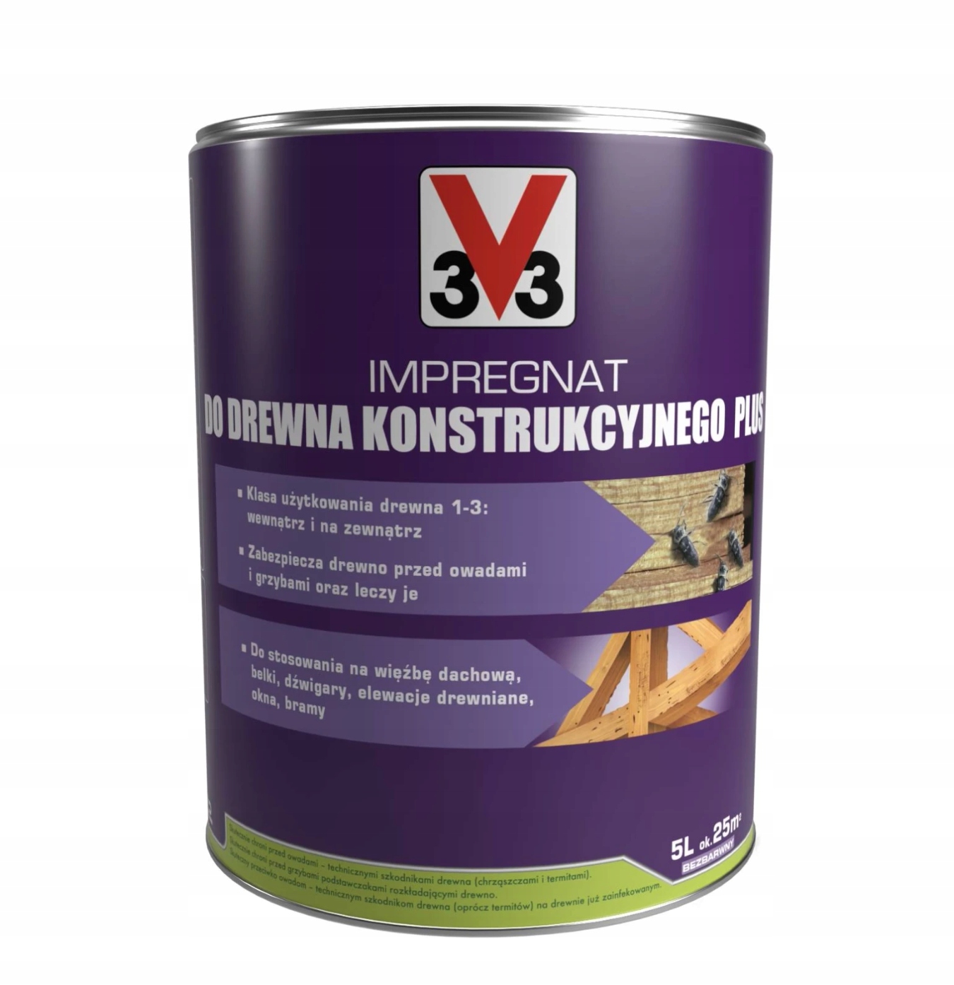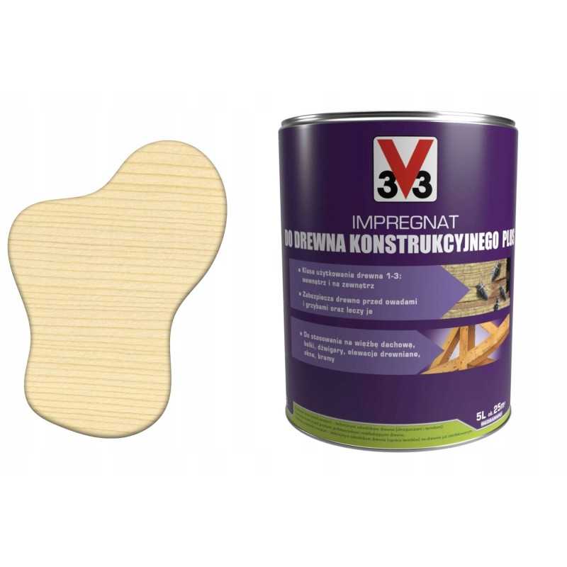 Impregnat do drewna konstrukcyjnego plus V33 przeznaczony jest do drewna w 1, 2 i 3 klasie użytkowania, tj. wewnątrz i na zewnątrz, do elementów drewnianych nie mających bezpośredniego kontaktu z gruntem ani wodą powierzchniową, ale narażonych na częste bądź okresowe nawilżanie.