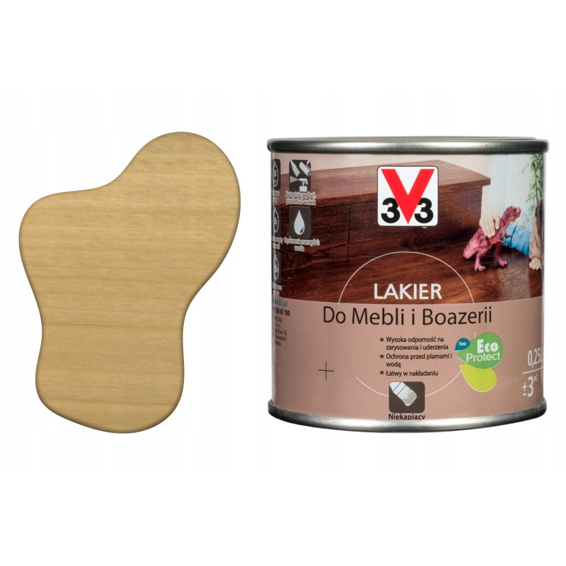 3V3 Lakier Akrylowy Wodny Eko to idealne rozwiązanie do odnawiania podłóg i schodów z drewna. Produkt marki V33 cechuje się wysoką jakością oraz odpornością na ścieranie. Lakier jest wodoodporny i posiada dekoracyjny, satynowy efekt. Może być stosowany wewnątrz pomieszczeń, a jego czas schnięcia wynosi jedynie 3 godziny. Dzięki możliwości aplikacji za pomocą natrysku, pędzla lub wałka, malowanie staje się łatwe i wydajne. Pojemność 250 ml pozwala na pokrycie dużej powierzchni, a bezbarwny kolor sprawia, że lakier doskonale pasuje do różnych rodzajów drewna.