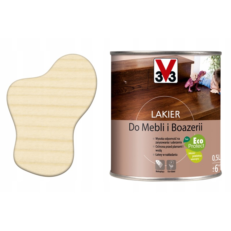 3V3 Lakier Akrylowy Wodny Eko Odporny Do Drewna - rewelacyjny produkt do renowacji podłóg i schodów. Lakier wodny marki V33 o pojemności 0,5L jest idealny do zastosowania wewnątrz pomieszczeń. Jego dekoracyjny efekt satyny oraz odporność na ścieranie i wodę sprawiają, że drewniane powierzchnie nabierają nowego blasku i są dodatkowo zabezpieczone. Można go aplikować pędzlem lub wałkiem, a szybkość schnięcia to tylko 3 godziny. Przyjemna wydajność 12 metrów kwadratowych sprawia, że lakierowanie staje się łatwe i efektywne.