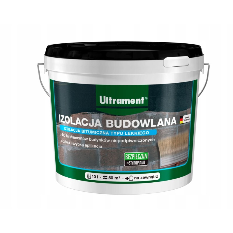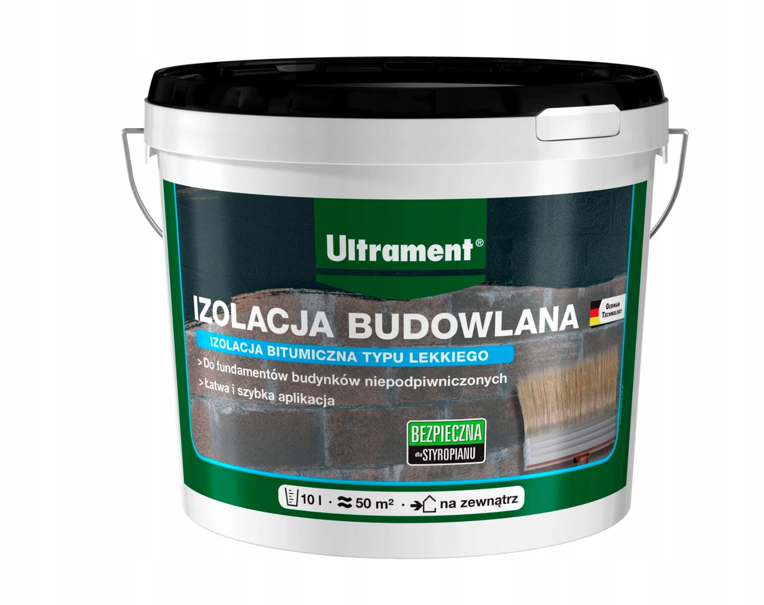 Ultrament Izolacja budowlana to wysokiej jakości masa bitumiczna, idealna do izolacji fundamentów. Produkt jest nowy, zapakowany w oryginalne opakowanie o pojemności 10 litrów. Kod producenta to Ultrament Izolacja bitumiczna budowlana 10L, a marka to Ultrament. Waga produktu wynosi 10 kilogramów, a z opakowaniem jednostkowym 15 kg. Numer EAN to 4002019612119. Ta izolacja budowlana należy do kategorii materiałów izolacyjnych i zapewnia skuteczną ochronę fundamentów przed wilgocią i innymi czynnikami zewnętrznymi.