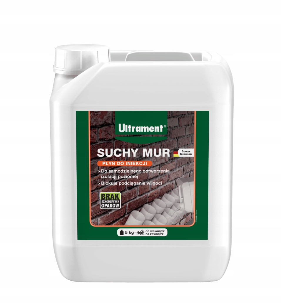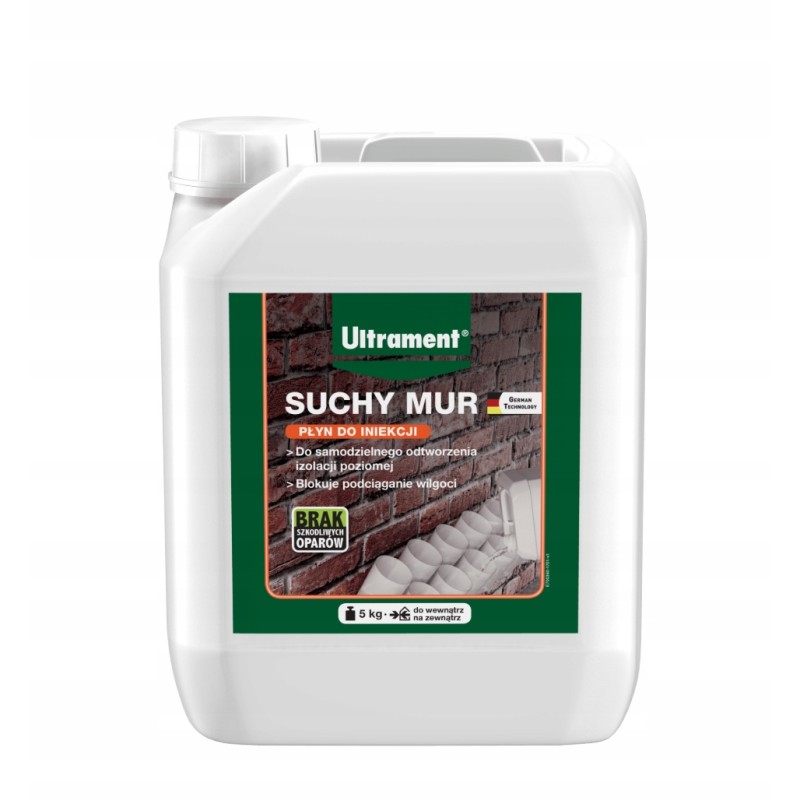 Ultrament Suchy Mur to preparat do iniekcji krystalicznej muru o pojemności 5l. Produkt jest nowy i zapakowany w oryginalne opakowanie marki Ultrament. Stan produktu jest nienaruszony, a kod producenta to ND.B47610000196108. Ten wyjątkowy preparat to folia w płynie, ważąca 6 kg. Produkt zapewnia skuteczną izolację muru, chroniąc go przed wilgocią i uszkodzeniami. Idealny do zastosowania w kategorii materiałów izolacyjnych. EAN: 4002019860015.