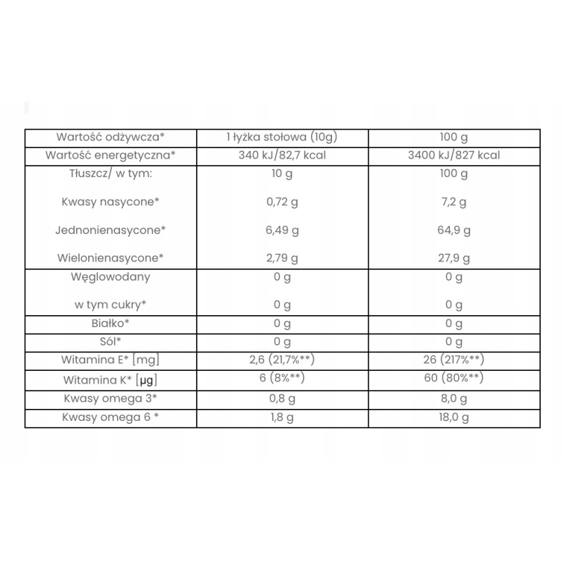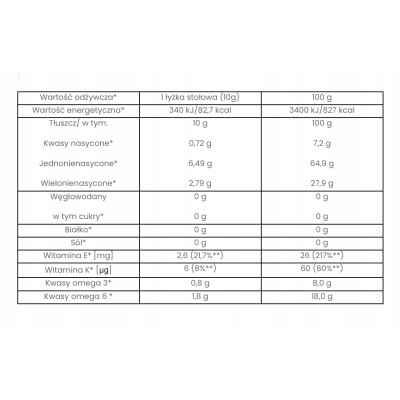✅ Bogactwo kwasów omega-3 i omega-6 – zawiera kwas alfa-linolenowy (ALA), który pomaga w utrzymaniu prawidłowego poziomu cholesterolu we krwi.