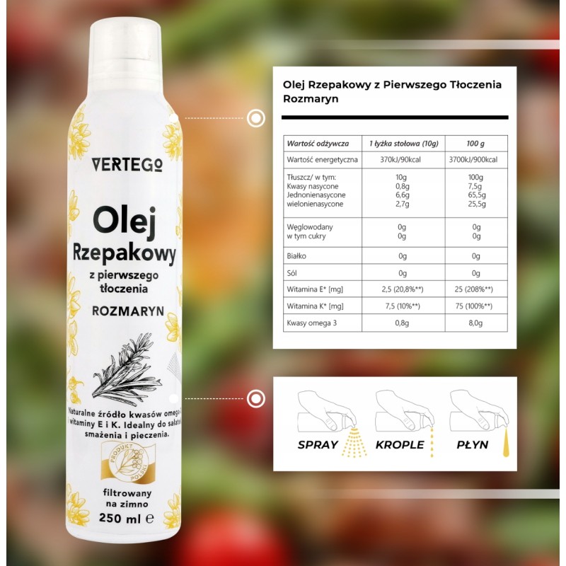 ✅ Naturalny i zdrowy skład – zawiera 98% oleju rzepakowego i 2% naturalnego aromatu rozmarynu, bez konserwantów i sztucznych dodatków.