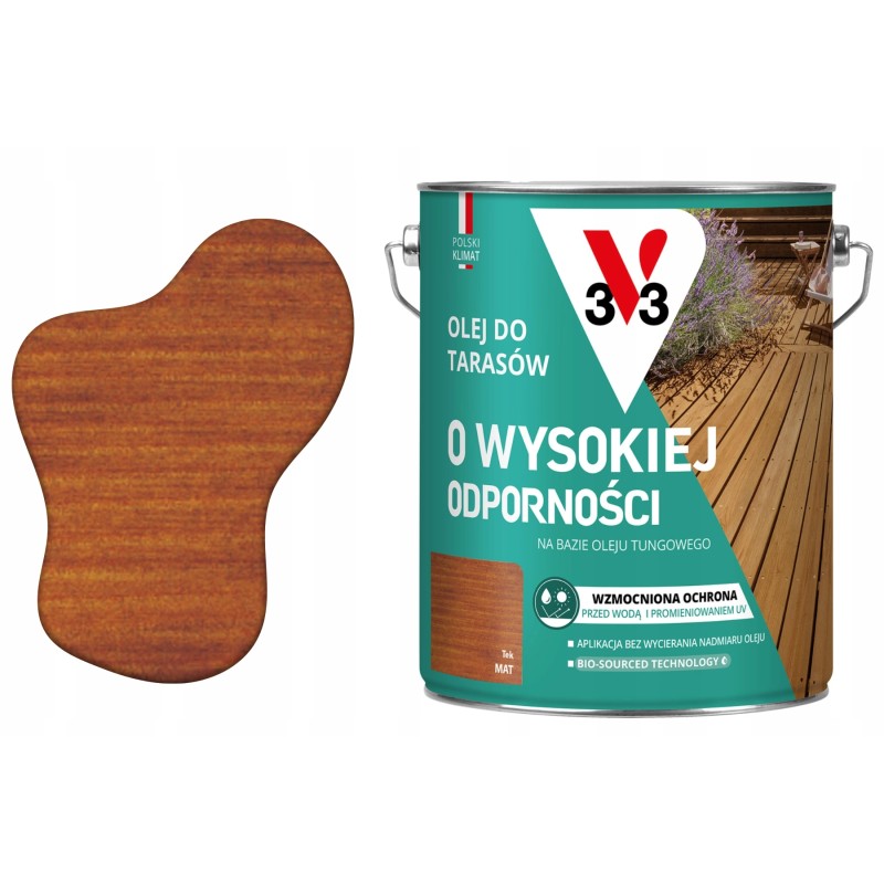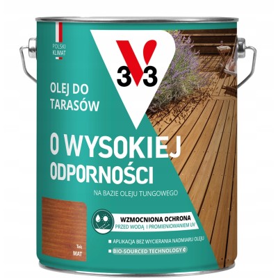 V33 OLEJ DO TARASÓW O WYSOKIEJ ODPORNOŚCI to doskonały produkt do pielęgnacji drewna na zewnątrz. Oferuje nowy stan i oryginalne opakowanie, zapewniające bezpieczne przechowywanie. Kod producenta 3153895232258 oraz marka V33 gwarantują wysoką jakość produktu. Olej mieści się w pojemnościowym wiadrze o pojemności 4,5 litra. Dzięki specjalnej formule, olej zapewnia ochronę drewna przed warunkami atmosferycznymi. Sprawdza się doskonale na tarasach i innych elementach drewnianych na zewnątrz.