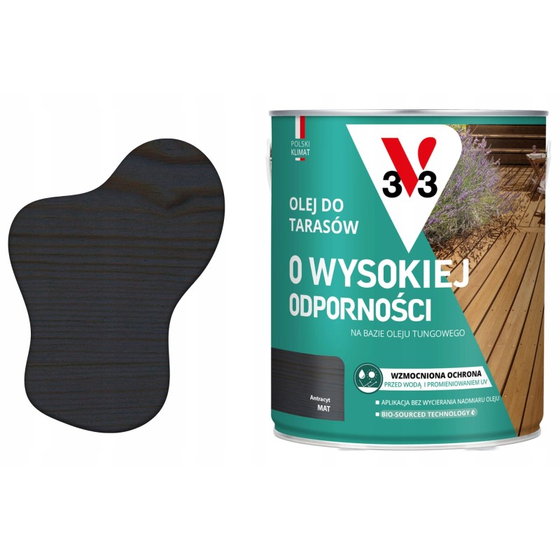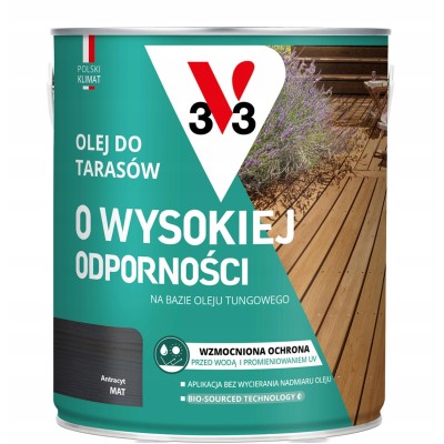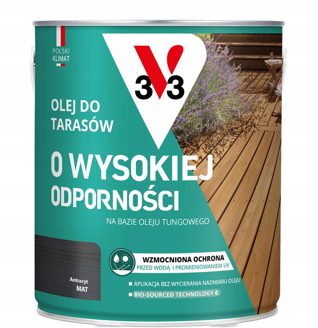 V33 OLEJ DO TARASÓW O WYSOKIEJ ODPORNOŚCI w kolorze antracyt o pojemności 2.5l to idealne rozwiązanie dla Twojego tarasu. Dzięki dwuwarstwowej ochronie, zapewnia nie tylko piękny matowy wygląd, ale także doskonałą ochronę przed warunkami atmosferycznymi na zewnątrz. Łatwy sposób aplikacji za pomocą pędzla sprawia, że nakładanie jest proste i szybkie. Ten nowy produkt marki V33 zapewnia wysoką jakość i wydajność, a oryginalne opakowanie gwarantuje świeżość i trwałość formuły.