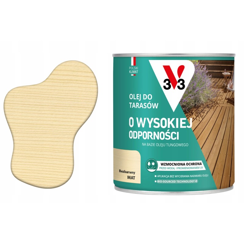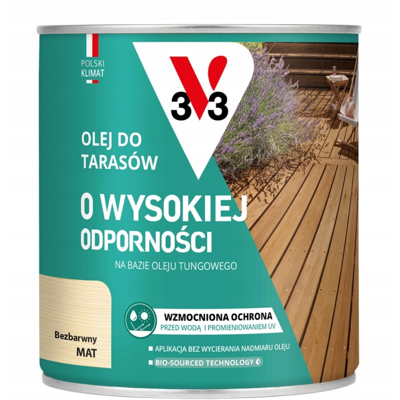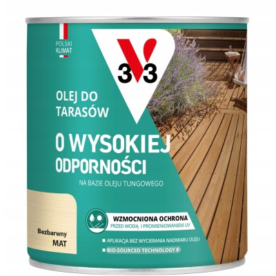 Olej do tarasów V33 o wysokiej odporności bez koloru w pojemności 0,75l to doskonały produkt do zabezpieczania drewnianych powierzchni na zewnątrz. Dzięki oryginalnemu opakowaniu i wysokiej jakości marki V33, ten olej zapewnia skuteczną ochronę drewna przed warunkami atmosferycznymi. Idealny do tarasów, mebli ogrodowych i innych elementów na zewnątrz. Przeznaczony do nowych drewnianych powierzchni, ten olej zagwarantuje długotrwałą ochronę i zachowanie naturalnego wyglądu drewna. Olej V33 to niezawodny wybór dla tych, którzy chcą cieszyć się pięknym drewnem przez wiele lat.