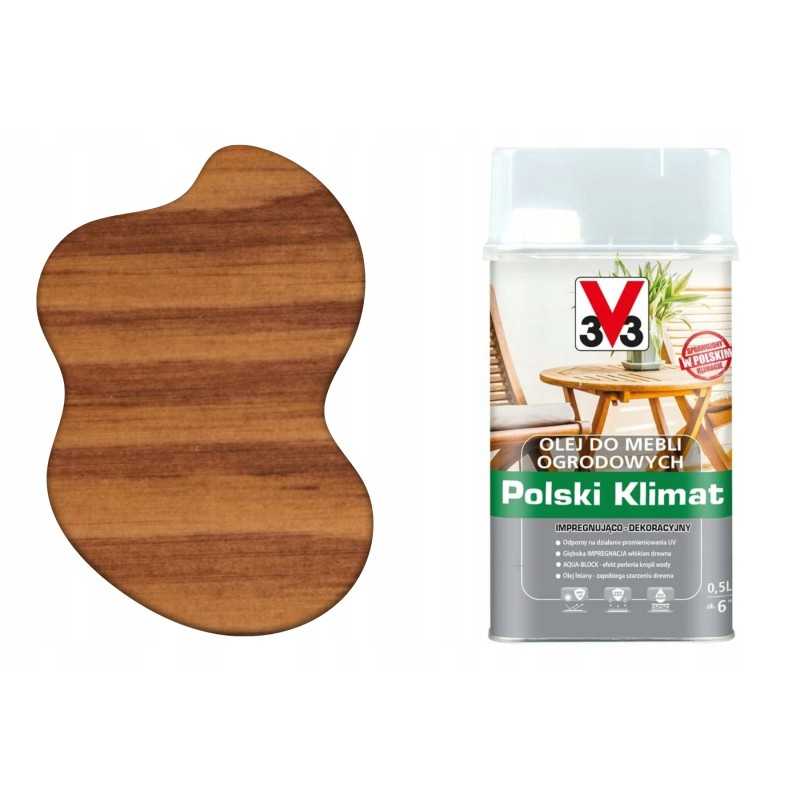 Olej V33 do mebli ogrodowych Polski Klimat tek 0.5 l to doskonały wybór dla osób poszukujących skutecznego i trwałego rozwiązania do ochrony drewnianych mebli na zewnątrz. Produkt cechuje się wysoką wydajnością, matowym efektem oraz odpornością na wysokie temperatury i wodę. Dzięki dwóm warstwom oleju, meble będą odpowiednio zabezpieczone i prezentować się świetnie przez długi czas. Prosty w aplikacji za pomocą pędzla, szybko schnie (po 3 godzinach) i zapewnia skuteczną ochronę. Olej V33 to gwarancja jakości i trwałości dla Twoich mebli ogrodowych.