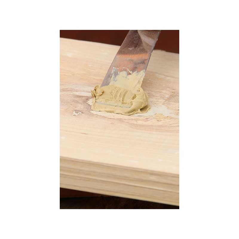 ✅ Nałożyć kit do drewna i wyrównać, dociskając nożem do zatykania. Kit nie klei się i nie roluje się pod łopatką. Aby uzyskać idealny efekt, po wysuszeniu przeszlifować papierem ściernym o gradacji 240.